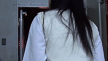 "Uniformed asian CFNM babe loves sucking two cocks"