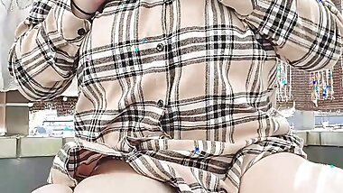 "Excited with no panties! A married woman can't hold back and wets her pussy in the store's toilet"